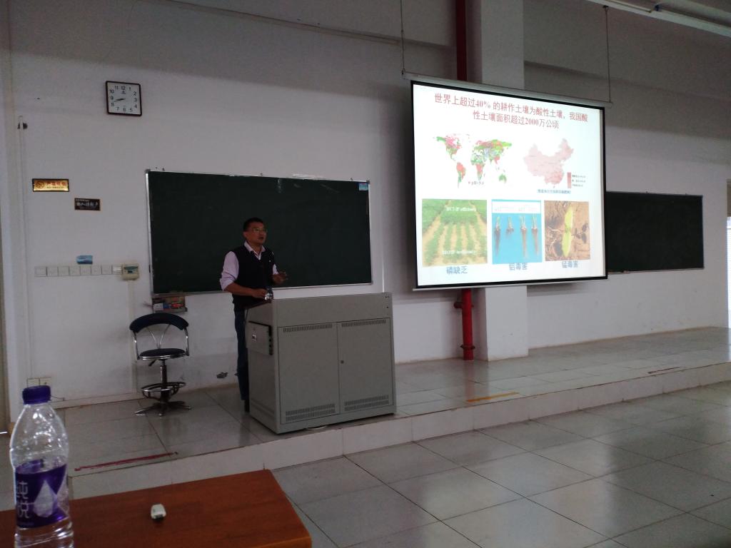 田江研究员从我国南方酸性土壤养分缺乏和元素毒害的问题出发,让现场师生深刻认识到了目前作物生长和生产所面临的严峻环境问题。紧接着,田江研究员以豆科作物大豆为代表,详细的讲解了自己团队长期以来在大豆耐低磷方面的研究进展。从早期的在田地里挖根观察根系构型到后来融合分子生物学的手段研究根系磷信号网络调控机理,深入浅出的讲解充分激发了师生的研究热情。最后,田江研究员同师生们进行了半个多小时的热烈交流和深入探讨。