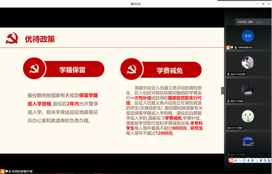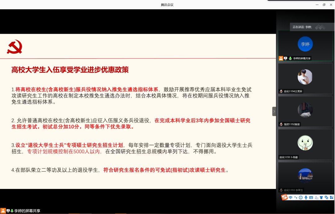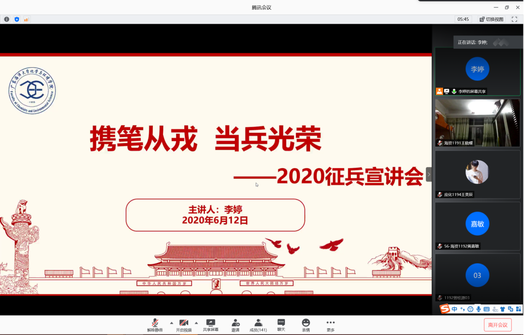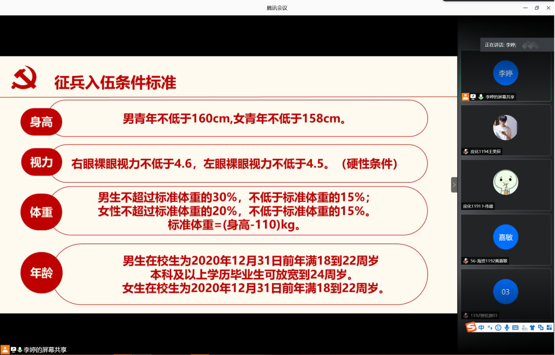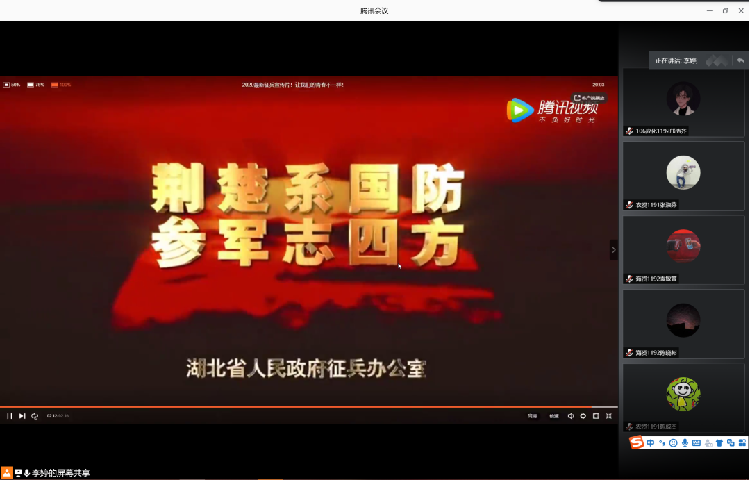 为增强学生入伍积极性,鼓励学生携笔从戎,积极入伍,6月12日晚,77779193永利集团在腾讯会议室召开2020年征兵宣讲会。会议由辅导员李婷主讲,77779193永利集团2019级学生共计160余人参加此次宣讲会。