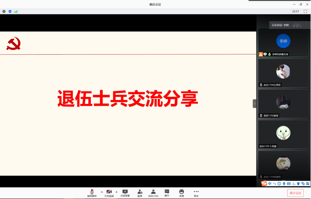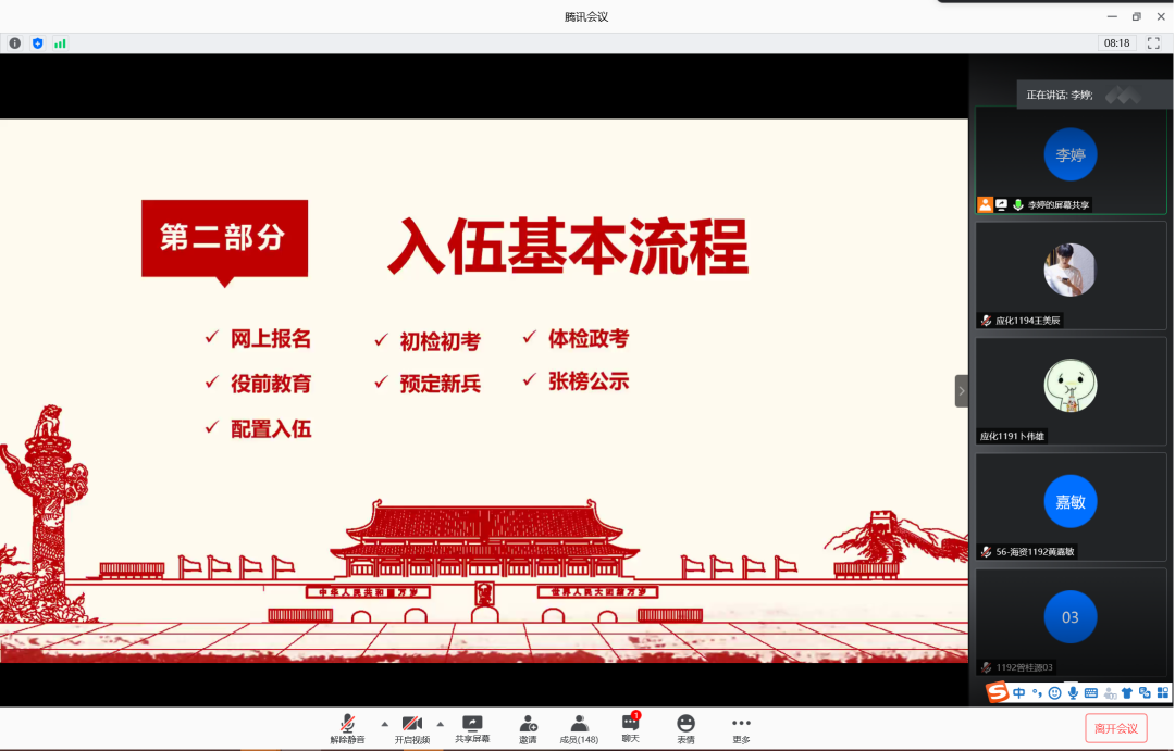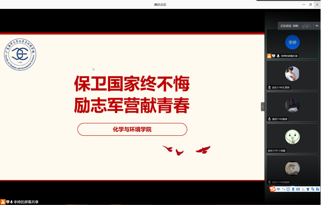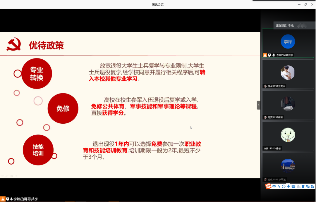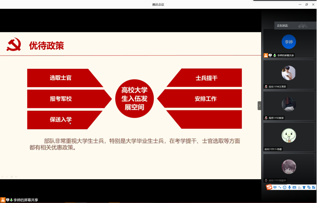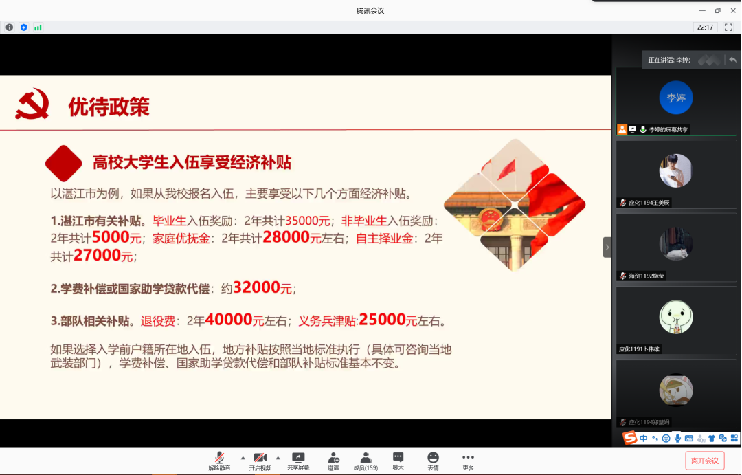 为增强学生入伍积极性,鼓励学生携笔从戎,积极入伍,6月12日晚,77779193永利集团在腾讯会议室召开2020年征兵宣讲会。会议由辅导员李婷主讲,77779193永利集团2019级学生共计160余人参加此次宣讲会。