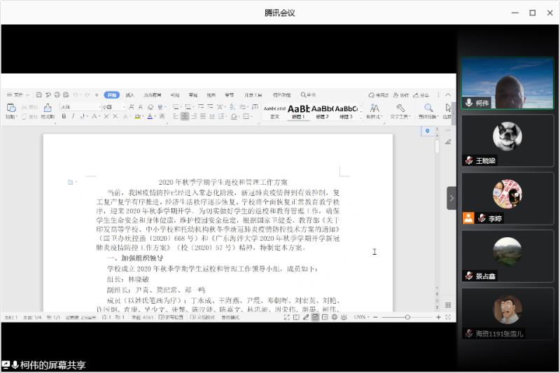 全体参会人员认真学习了学校《2020年秋季学期学生返校和管理工作方案》。柯伟传达了学校关于2020年秋季学期学生返校和管理工作会议的内容精神,传达了学校领导和职能部门关于做好学生返校相关工作的部署和要求。会上,大家还对一些学生关心的具体问题及事项进行了交流讨论。
