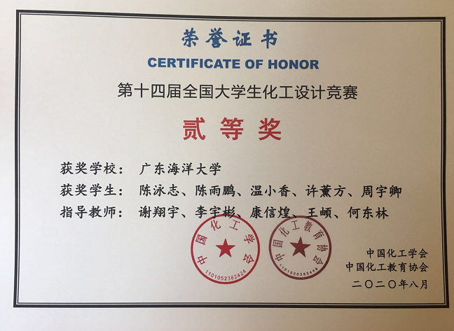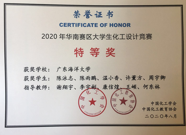 8月27日-30日,2020“东华科技杯”第十四届全国大学生化工设计竞赛全国总决赛在合肥工业大学举行,我院共有两支队伍代表学校参赛。其中,“烷美无炔”队(队员:陈泳志、温小香、许薰方、陈雨鹏、周宇卿,指导教师:谢翔宇、李宇彬、康信煌、王頔、何东林)作品“中化弘润石油化工公司40万吨异戊二烯项目”获全国二等奖、华南赛区特等奖,“小皮PM”队(队员:潘志颖、李凤婷、梁嘉敏、林云莹、张颖仪)获得华南赛区一等奖。