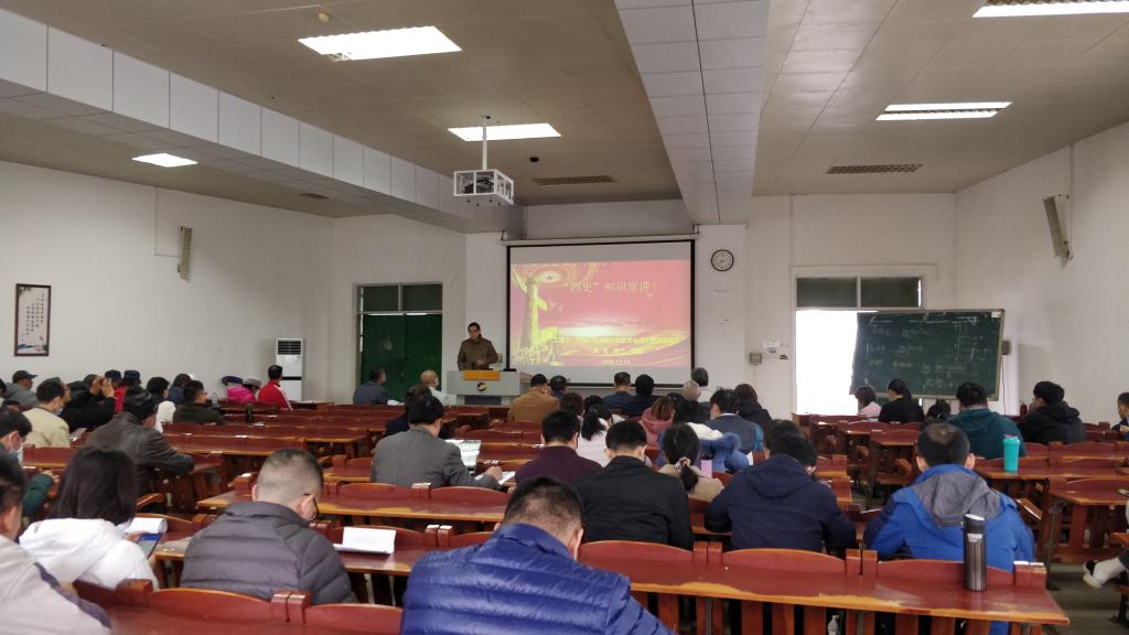 12月16日下午,化环学院和体育学院组织全体教职工在主楼330教室共同举行学习“四史”暨党的十九届五中全会精神学习宣讲报告会。宣讲报告会由学校党委理论宣讲团成员杜军教授主讲,化环学院党委书记蔡鹰主持。
