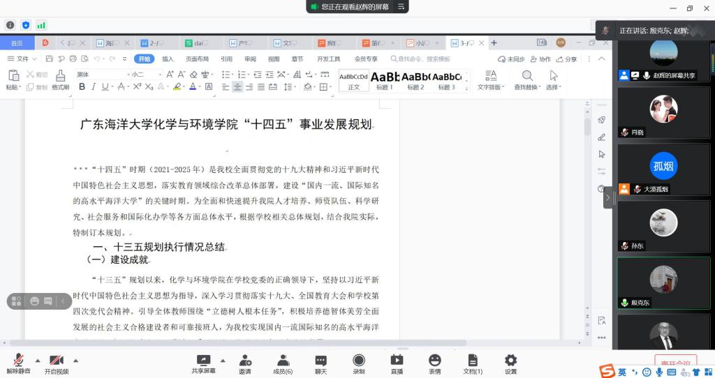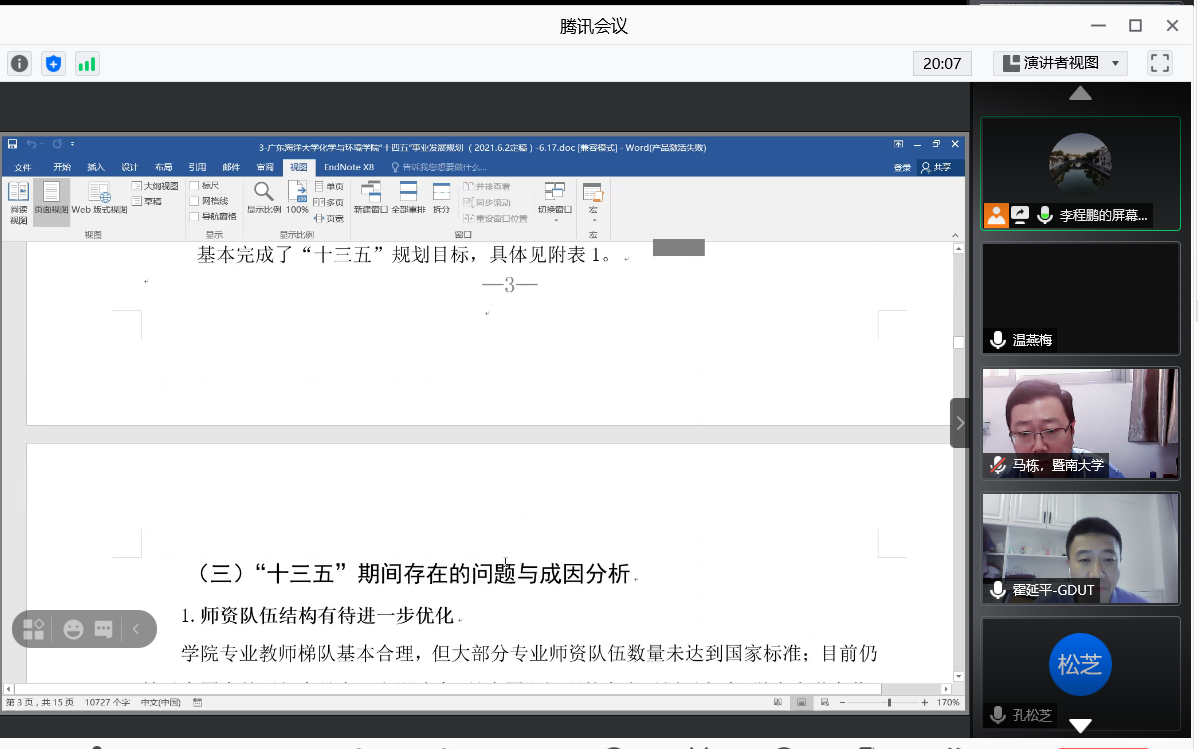 2021年6月19日-20日,根据学院十四五规划方案编制的需要,77779193永利集团在腾讯会议上召开十四五规划专家论证会,会议邀请了来自中山大学的殷克东教授、英国诺丁汉特伦特大学的潘刚教授、广东工业大学霍延平教授和暨南大学马栋教授。会议由赵辉副院长(主持学院行政全面工作)主持,资环系和应化系负责人及相关专业骨干教师参加了此次论证会。