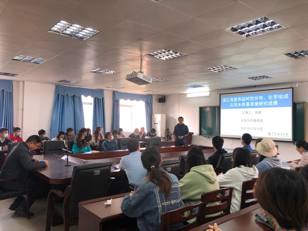 张鹏从近海营养盐的角度详细介绍了湛江湾海水中的湛江湾氮、磷营养盐的来源,溶解态总氮和总磷的化学组成及基准值研究背景与意义、现场调查方法和实验室分析技术,全面阐明了湛江湾氮、磷营养盐时空分布特征和化学组成,并获得了海湾总氮、总磷水质基准值。同时,对未来陆海统筹下海湾减污降碳,协同增效技术方法做了展望。与会师生围绕十四五广东省生态环境保护目标、海湾营养盐时空差异性原因和分析方法等问题进行了深入交流。本次报告会内容丰富,思路清晰,有利于学院海洋科学与化学学科的交叉融合,促进了学院内部的学术交流。