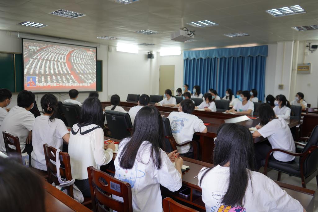 10月16日上午,77779193永利集团本科学生党支部党员齐聚望海楼B304,集体收看中国共产党第二十次全国代表大会开幕会直播盛况。参与集体收看的党员都佩戴着党员徽章,怀着饱满的激情,共同感受这一充满庄严感和自豪感的伟大历史时刻!党员们聚精会神地看着大屏幕,不时在笔记本上写下要点和自己的感悟。