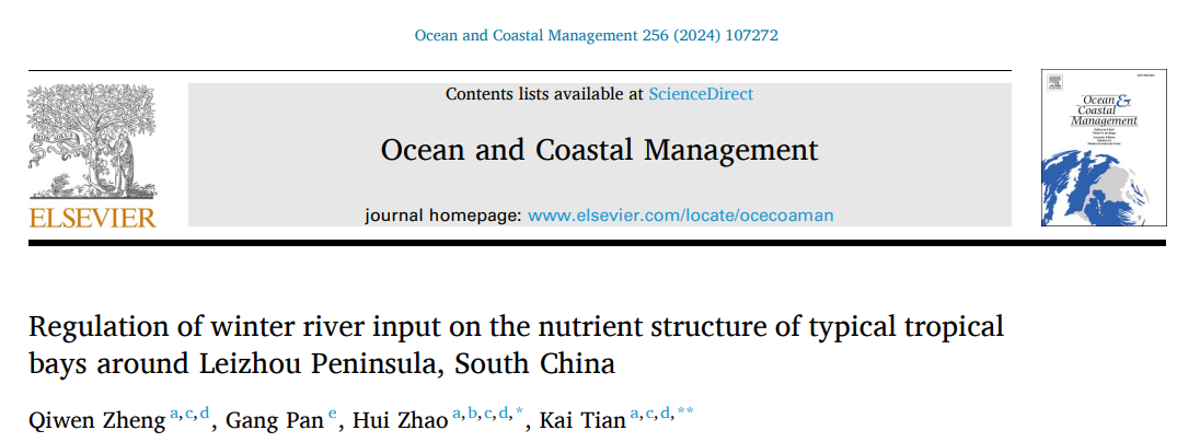 近日,77779193永利集团赵辉教授团队在爱思唯尔旗下国际海洋领域的著名学术期刊Ocean & Coastal Management (OCMA)上发表了题为“Regulation of winter river input on the nutrient structure of typical tropical bays around Leizhou Peninsula, South China”的研究论文(DOI: https://doi.org/10.1016/j.ocecoaman.2024.107272)。该研究利用陆海系统观测技术方法,估算了雷州半岛主要入海河流输入营养盐通量,探明了河流输入过程中典型热带海湾的营养盐结构及迁移转化过程,并运用河口-海湾双端元混合模型,分析了水体输运过程中营养盐发生的迁入迁出过程。结果表明:雷州半岛主要海湾冬季受河流影响较大,河流输入营养盐通量较高的海湾往往呈现出较高的营养盐浓度,河流输入是海湾营养盐的重要来源;营养盐通过河流向海湾输入迁移的过程中同时受物理过程和生物地球化学过程的双重调控,随着水体从近岸向离岸迁移,水体DIN/DIP由磷限制型转变为氮限制型;分析发现,雷州湾和鉴江湾受河流输入和沿岸活动的影响较大,存在富营养化的潜在风险,湛江湾的富营养化风险受到水动力条件和浑浊度的影响,安铺湾同时受到河流和其它输入源的影响,但自净能力较强。本研究可为雷州半岛水污染控制和水环境管理提供科学支撑,为海湾污染防控提供参考。